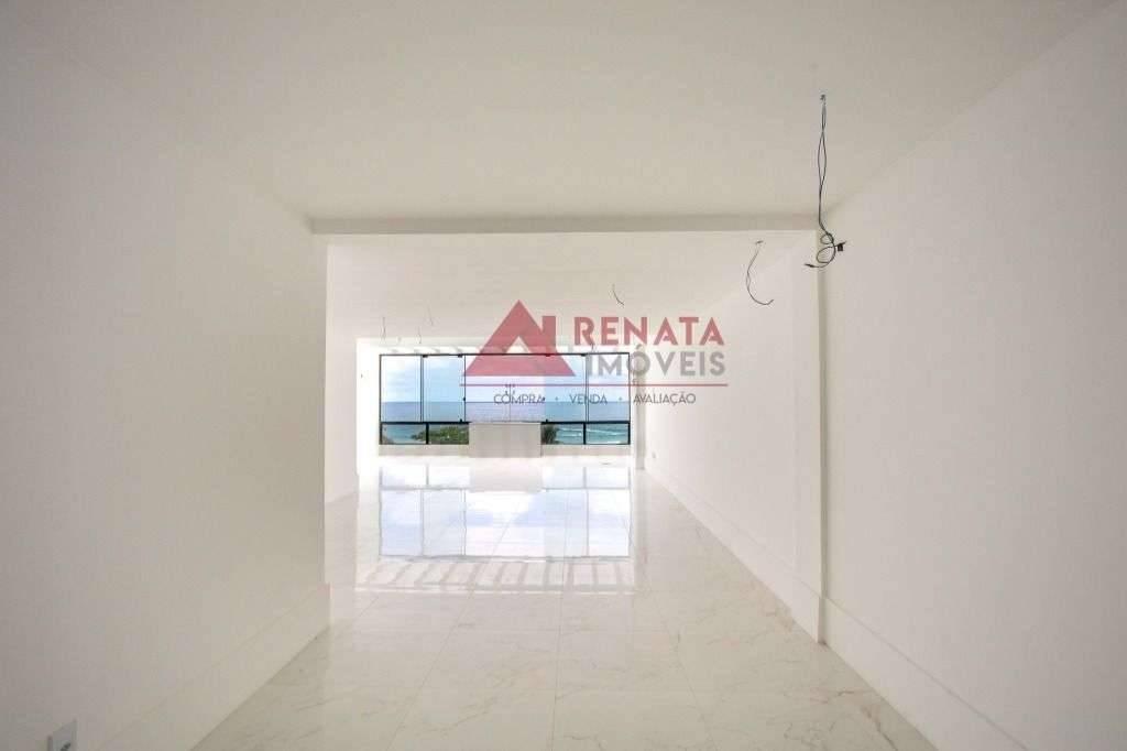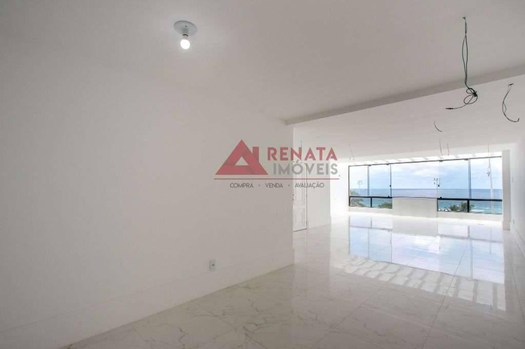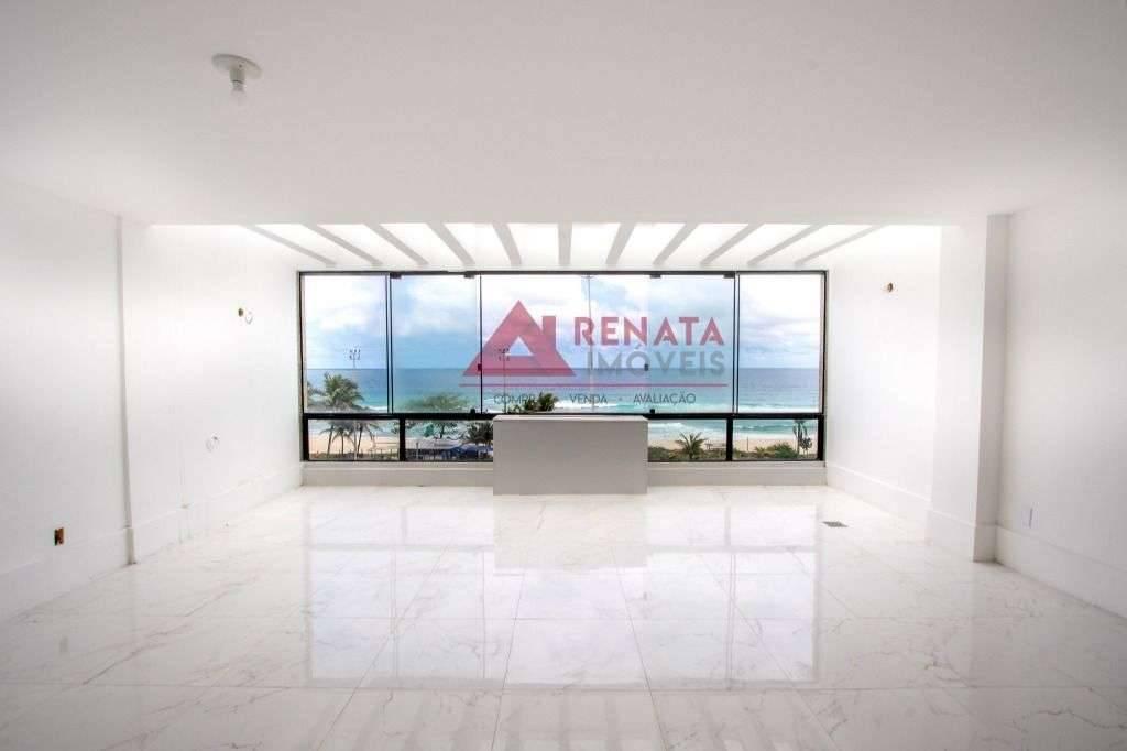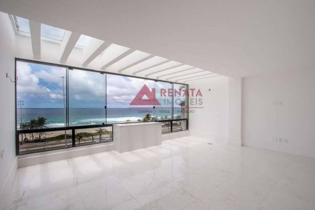 Primeiro pavimento: sala para dois ambientes, vista para a Praia da Barra da Tijuca, imóvel claro, luz natural, lavabo com bancada de mármore, três quartos com suítes, blindex, bancada de mármore, cozinha grande, área de serviço, lavanderia bem ventilada na área externa da cobertura.